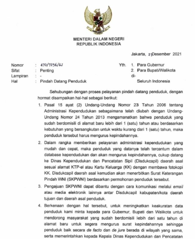 Ia menambahkan, proses pengurusan surat pindah kini jauh lebih mudah. Cukup datang ke Disdukcapil daerah asal dengan membawa fotokopi Kartu Keluarga (KK), warga bisa langsung mendapatkan Surat Keterangan Pindah WNI (SKPWNI). Bahkan, koordinasi antar Disdukcapil kabupaten/kota bisa dilakukan melalui email atau media elektronik lainnya.